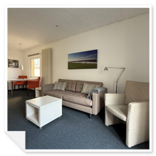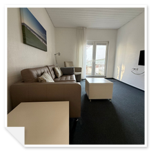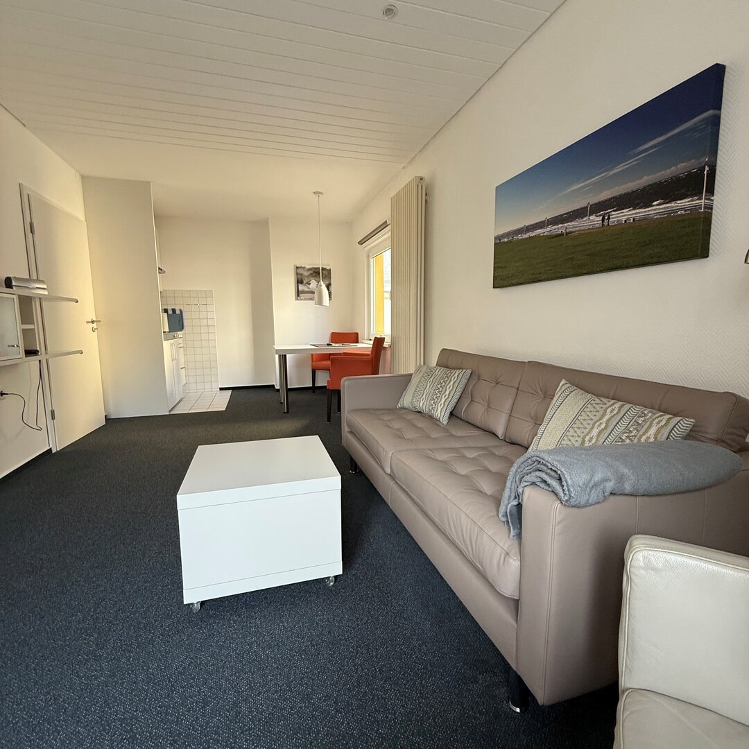 Unsere 2 Raum Ferienwohnung Borkum ist ca. 40 qm groß und liegt in der ersten Etage.Sie verfügt über ein Schlafzimmer zur ruhigen Südseite. Das Wohnzimmer mit Balkon und integrierter Küchenzeile ist mit einem Sofa, 81cm LCD-Flatscreen TV (Kabel) und Radio ausgestattet.