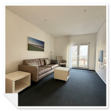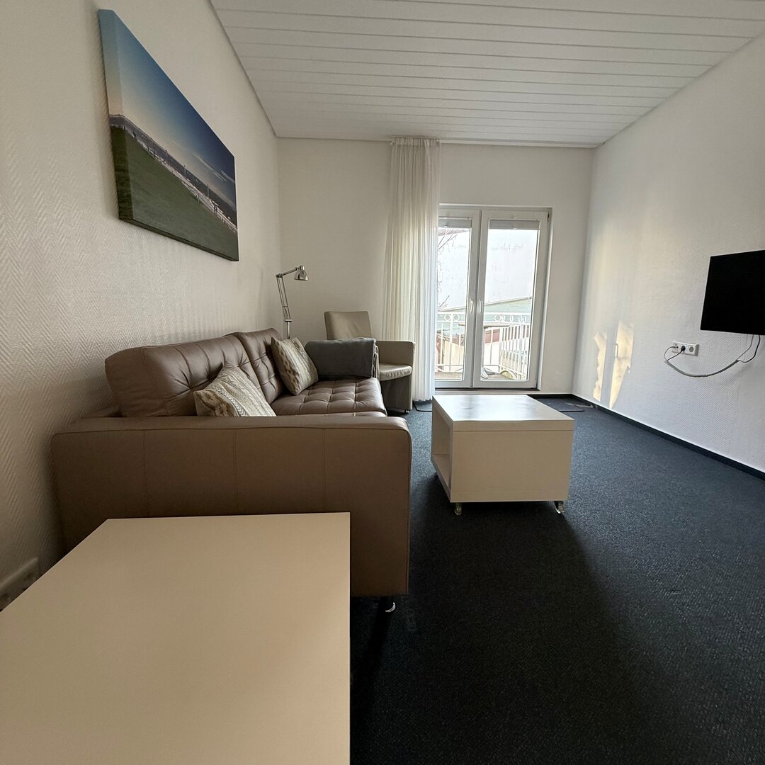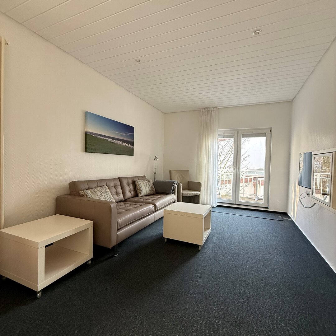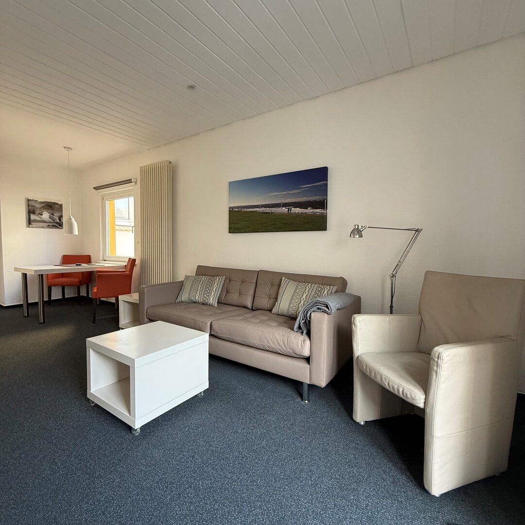 Unsere 2 Raum Ferienwohnung Borkum ist ca. 40 qm groß und liegt in der ersten Etage.Sie verfügt über ein Schlafzimmer zur ruhigen Südseite. Das Wohnzimmer mit Balkon und integrierter Küchenzeile ist mit einem Sofa, 81cm LCD-Flatscreen TV (Kabel) und Radio ausgestattet.